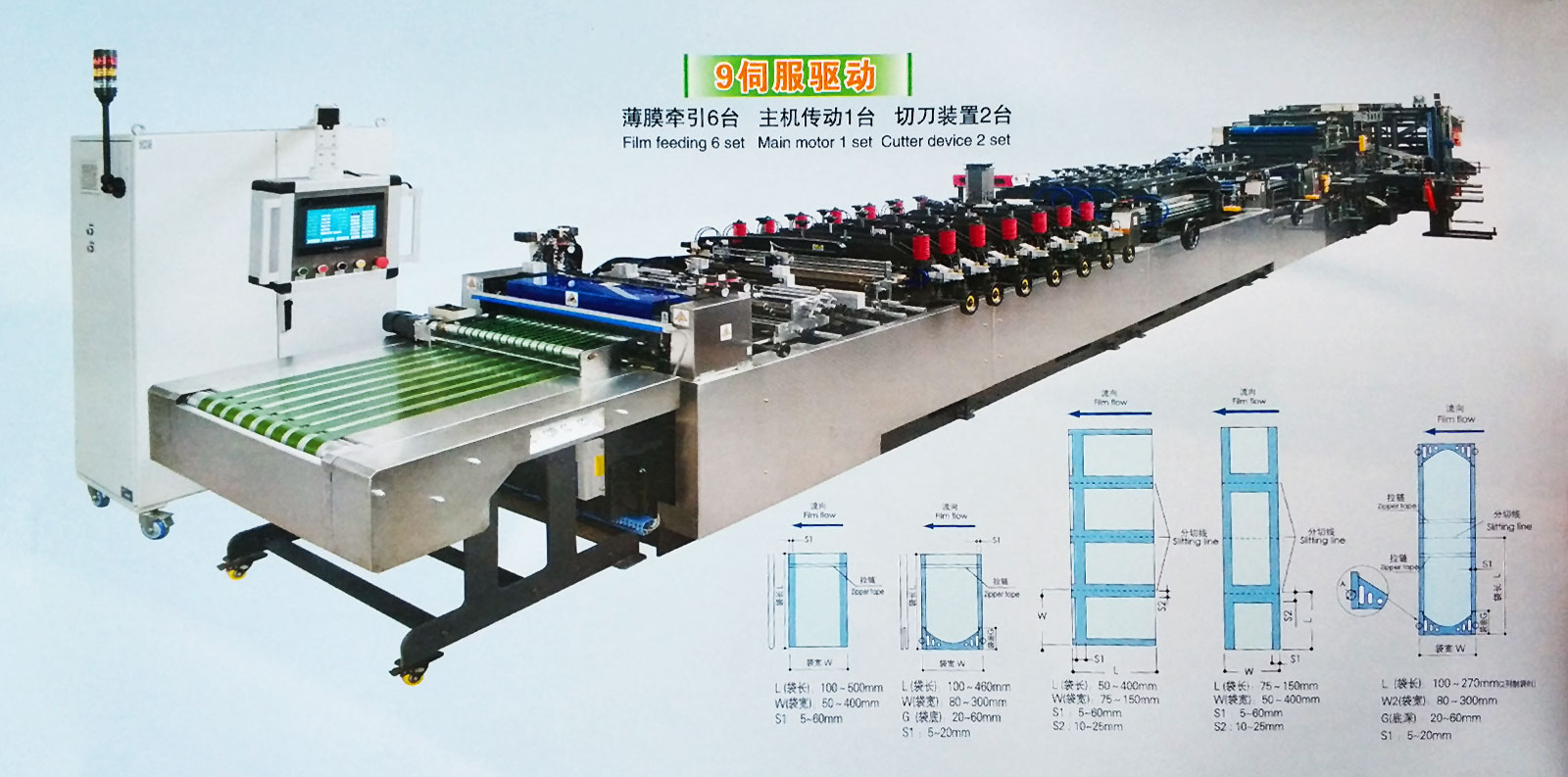 | YSZD-600HK Ⅰ上下圖案跟蹤 三邊封、站立袋、拉鏈袋、無接縫站立拉鏈袋高速全自動制袋機 |
